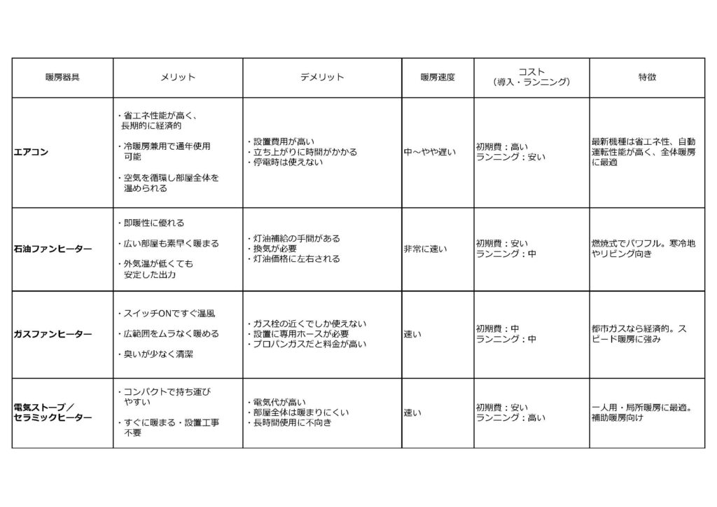 エアコンやガス暖房は本体価格・設置費が高めですが、長期的に見ると燃費効率が良く、トータルコストでは安く済む場合もあります。