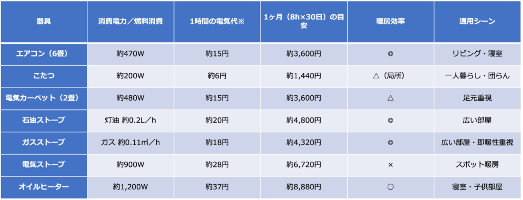 しかし、「どれが一番安いのか」は使い方次第です。ここでは、主要7種類の暖房器具について、 「1時間あたりの電気代」「1ヶ月使った場合の目安費用」「暖房効率」「適した使用シーン」を比較表で整理していきます。