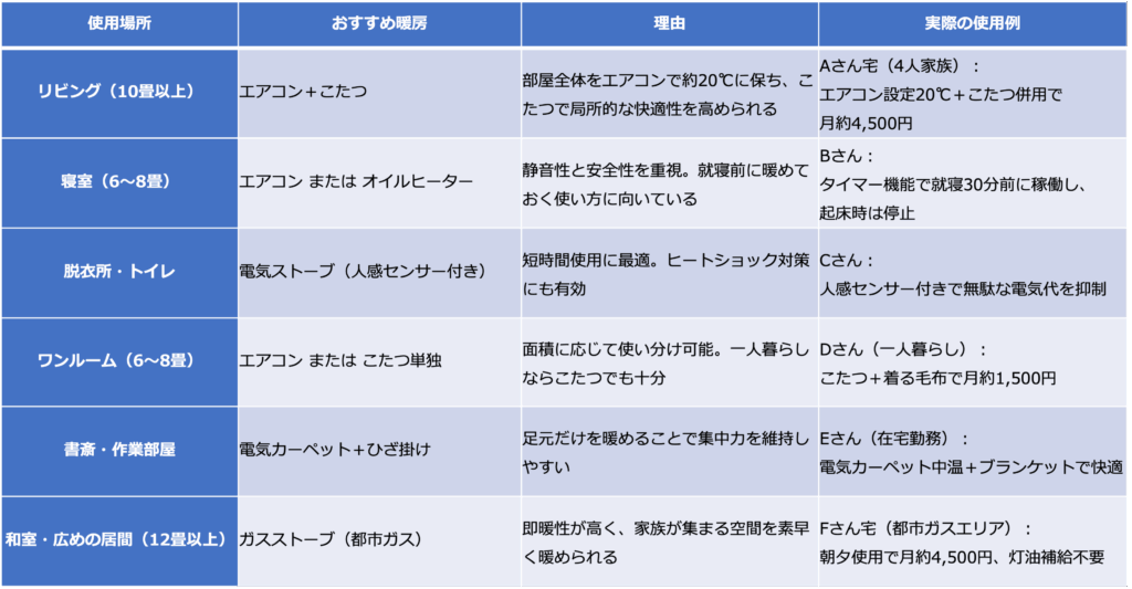 ここでは、リビング、寝室、脱衣所、ワンルームなど、 代表的な5つのシーンごとに「最もコスパの良い暖房器具の組み合わせ」を提案。