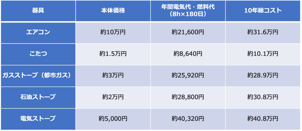 暖房器具は「本体価格」だけでなく、「毎月の電気代・燃料代」も重要です。