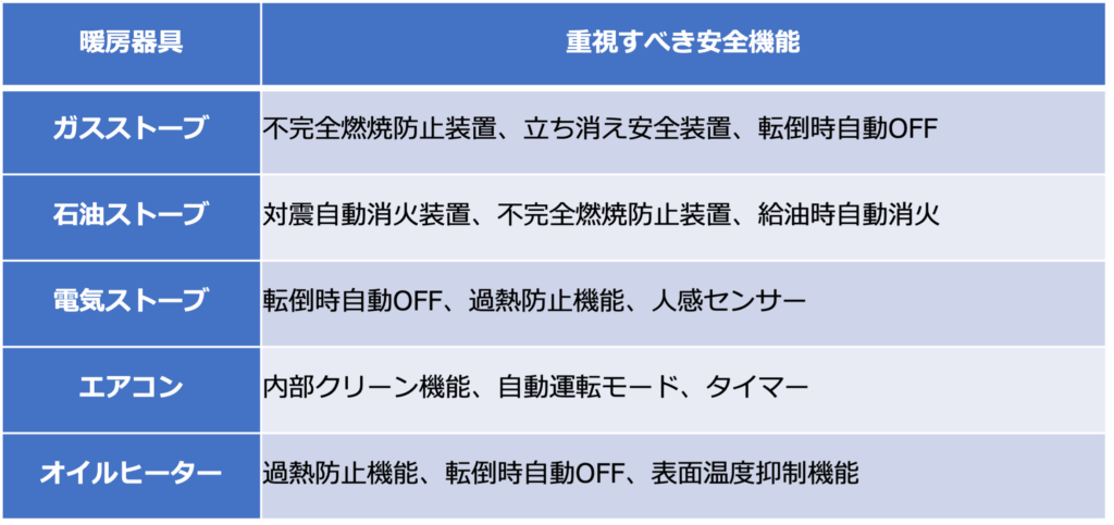 【暖房器具別・特に重視すべき安全機能】