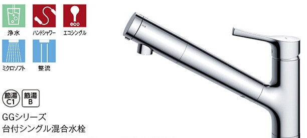 キッチン用台付1穴タイプのシングル混合水栓。引き出しハンドシャワー(ホース最長450 mm)付きでシンク掃除に便利。エコシングルレバー採用で湯水のムダ使いを防止し、整流・ミクロソフトへの切替も可能です。